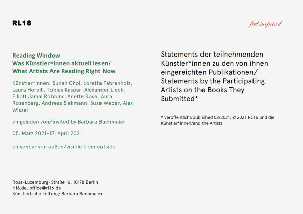 Sunah Choi, Loretta Fahrenholz, Laura Horelli, Tobias Kaspar, Alexander Lieck, Elliott Jamal Robbins, Anette Rose, Aura Rosenberg, Andreas Siekmann, Suse Weber, Alex Wissel